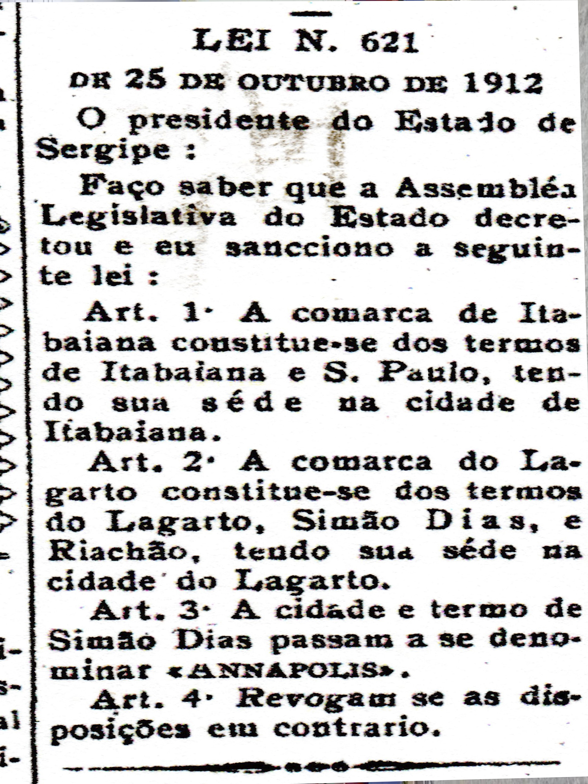 LEI ESTADUAL Nº 621 DE 25.10.1912 - O MUNICÍPIO PASSOU A SE CHAMAR ANNAPOLIS